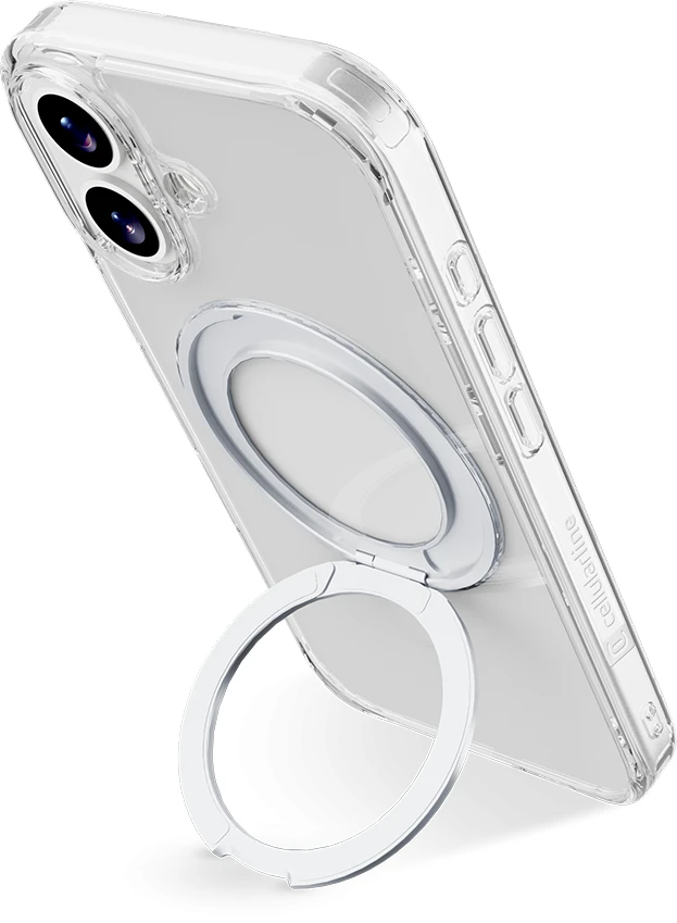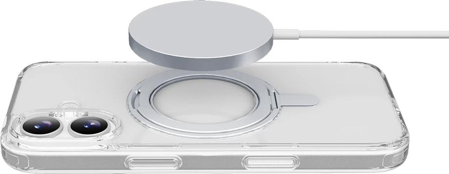 SPIN MAG ist die transparente Hülle mit drehbarem Ständer, die mit dem MagSafe-System kompatibel ist. Es zeichnet sich durch einen um 360 Grad drehbaren Ring aus, der es dem Gehäuse ermöglicht, verschiedene Funktionen wie Stand- und Halterungsfunktionen zu übernehmen. Der Ring ist integriert und wird bei Nichtgebrauch zu einem integralen Bestandteil des Gehäuses, sodass es mit MagSafe-Zubehör kompatibel ist. Die erhöhten Kanten rund um das Display und die Kamerabereiche schützen das Telefon vor versehentlichen Stößen und Stürzen.